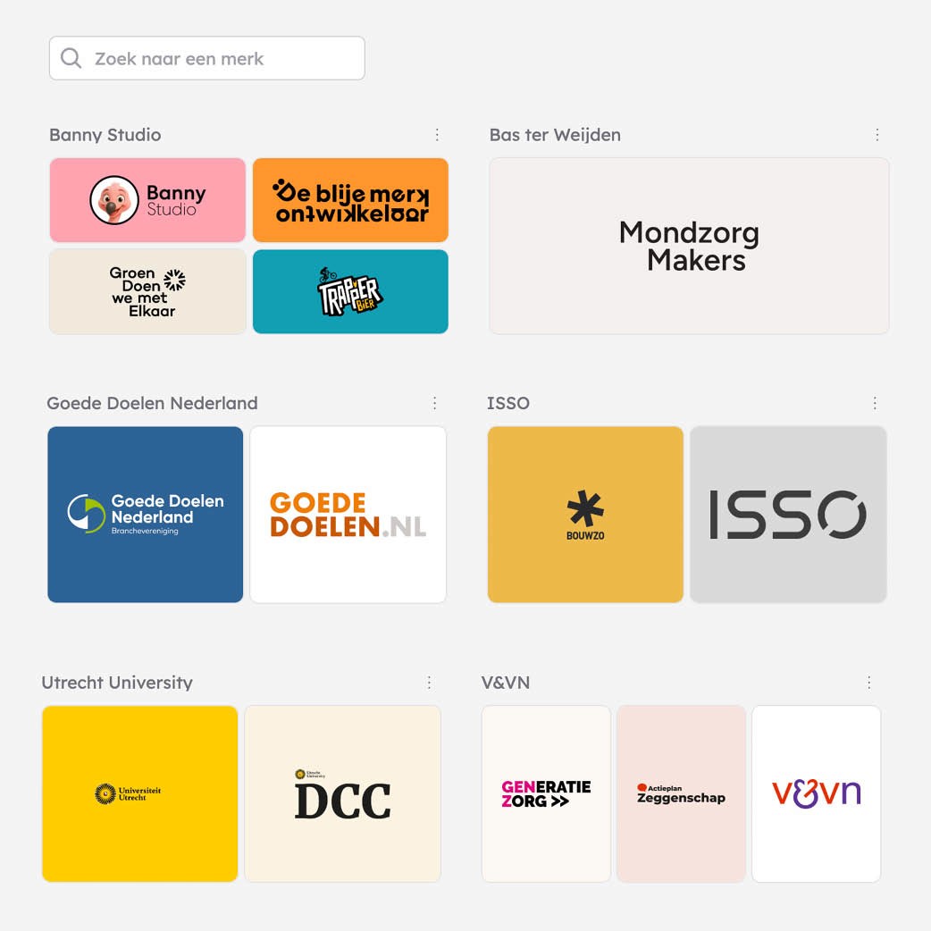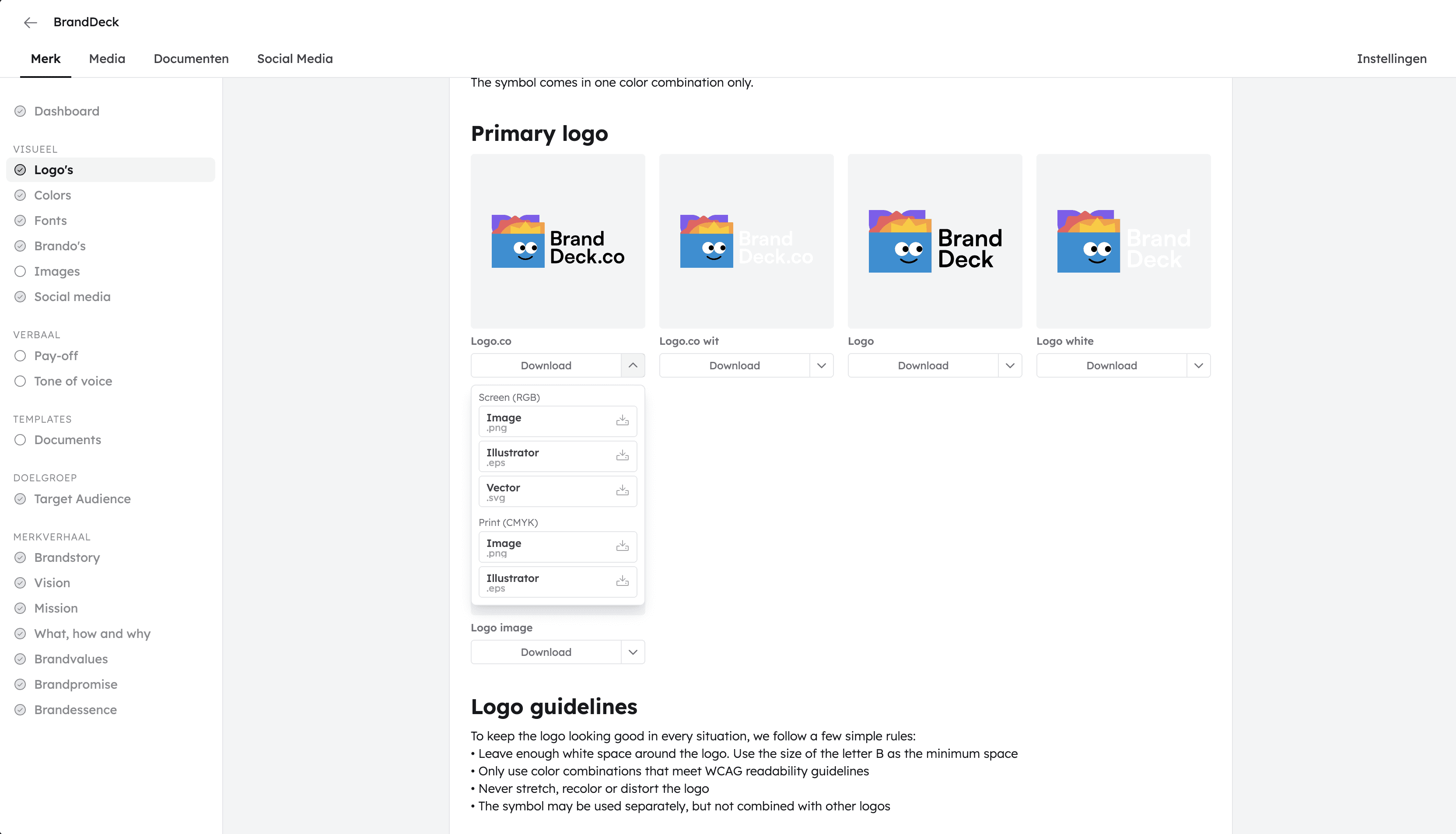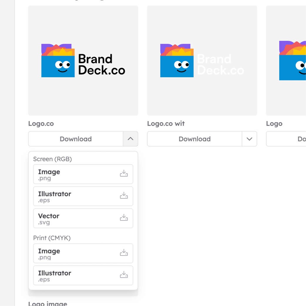 Upload different versions of your logo or assets. From CMYK to SVG, it's all there and easy to download.